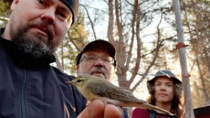 Kevään ensimmäinen rengastus pajulintu ja miehittäjät Tuomo Jaakkonen, Matti Tynjälä ja Oiva Latvalehto.